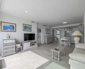 La entrada conduce a un baño, una cocina abierta con electrodomésticos de alta gama y un salón-comedor que se abre a una terraza con impresionantes vistas al mar. El dormitorio principal cuenta con baño en suite y acceso a la terraza, mientras que el segundo dormitorio doble es amplio y luminoso.