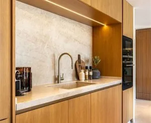 Al entrar, le recibe un elegante vestíbulo con una pared de madera y una iluminación sofisticada. El diseño de planta abierta incluye una cocina de diseño creada por Caroline Seimertz, con detalles de madera personalizados, electrodomésticos Siemens completamente integrados, una gran placa de inducción y una vinoteca. La isla de cocina incluye una mesa de comedor artesanal de madera, creando un espacio perfecto para comidas familiares o reuniones sociales.