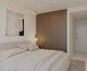 La distribución del apartamento se ha diseñado pensando en su comodidad diaria. Al entrar, el espacio se abre a una zona integrada de salón, comedor y cocina. La cocina, equipada con electrodomésticos de alta gama y acabados elegantes, constituye el corazón de la casa y ofrece una transición fluida hacia las zonas sociales. Desde el salón, el acceso directo a la terraza permite la entrada de luz natural a los interiores, a la vez que ofrece espacio para relajarse o comer al aire libre. Ubicada en la parte trasera, la suite principal ofrece tranquilidad y privacidad, con tranquilas vistas a los jardines comunitarios.