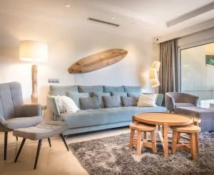 El apartamento consta de 3 dormitorios, 2 baños, una cocina abierta de calidad con barra americana y un amplio salón con acceso a la gran terraza (64m2), ideal para el estilo de vida soleado, con vistas a los jardines subtropicales y al valle de Nueva Andalucía. Los accesorios y accesorios de alta gama incluyen baños de mármol, cocinas equipadas con electrodomésticos de alta gama y una cocina al aire libre. La propiedad cuenta con plaza de aparcamiento subterráneo y trastero.