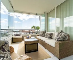 L'appartement dispose de deux chambres, chacune donnant accès à une terrasse vitrée de 31 m², dotée de rideaux en verre pliants pour plus d'intimité et de confort. La cuisine ouverte s'ouvre harmonieusement sur le séjour lumineux et spacieux, créant un espace convivial pour se détendre ou recevoir. La terrasse est un véritable atout : des portes-fenêtres entièrement fermées mènent au solarium qui prolonge votre espace de vie. Grâce à son orientation idéale, vous profiterez de magnifiques levers de soleil sur la mer et le parcours de golf de Miraflores. Pendant les mois les plus chauds, vous pouvez ouvrir la terrasse pour profiter de l'extérieur, et en hiver, la fermer pour profiter du confort douillet de l'intérieur.