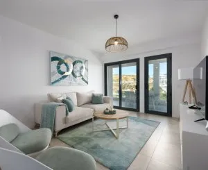 Il y a deux chambres doubles avec placards entièrement équipés, toutes deux bénéficiant de portes coulissantes, menant à la terrasse et partageant une salle de bains au design élégant. La chambre principale comprend un dressing équipé, une grande salle de bains privative et des portes-fenêtres donnant sur une terrasse privée. Ce développement a été magnifiquement conçu avec une grande piscine avec bassin pour enfants, des espaces de coworking communs, intérieurs et extérieurs, une salle de sport et un espace spa donnant sur une grande terrasse de détente commune.