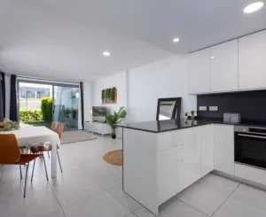 This elegant two-bedroom, ground-floor apartment is situated in the peaceful Selwo area of Estepona, offering contemporary comfort with a serene private garden. The home spans 93m² of beautifully designed space, including a bright open-plan living area and a well-equipped kitchen with premium Bosch appliances and a stylish breakfast bar. Large windows allow natural light to flood the lounge, which opens onto a covered terrace with lovely garden views, creating a perfect blend of indoor and outdoor living.