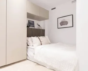 The master suite is a peaceful retreat, complete with built-in wardrobes and access to the picturesque private terrace. Here, you will find an outdoor dining and lounge area, as well as a grill and kitchen space, perfect for al fresco dining while enjoying front-line views of the golf course and Marbella’s typical blue, sunny skies. The electronically retractable awning allows you to enjoy the terrace in any weather, while security shutters and an alarm system provide peace of mind. The remaining two bedrooms, each equipped with double beds, are equally well-appointed and offer easy access to the contemporary bathroom they share.