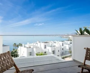 Роскошная современная квартира с видом на юго-запад и захватывающим панорамным видом на море, потрясающим днем и чарующим вечером и ночью. Входя, слева вы найдете гостиную с красивой частной террасой, а справа – обеденную зону с современной кухней, все соединено для максимального комфорта. Главная спальня имеет такой же потрясающий вид, как и терраса, и оснащена собственной ванной комнатой. Справа находится вторая спальня и вторая ванная комната, позволяя отделить зону отдыха от жилой зоны.