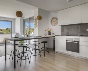 Гостиная просторная и с большим количеством света, в ней есть большие стеклянные двери для выхода на террасу, что создает идеальное ощущение внутреннего и внешнего пространства. Открытая кухня полностью оборудована качественной техникой и идеально сочетается с гостиной.