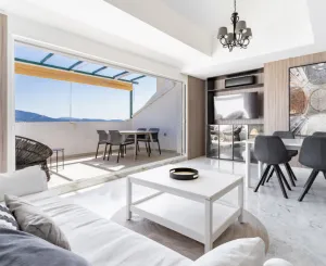 • На основном уровне находятся просторная гостиная-столовая с выходом на террасу, ориентированную на восток и с панорамными видами, полностью оборудованная кухня с отдельной прачечной, а также спальня с ванной комнатой и собственной террасой.