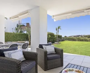 Эти апартаменты с 3 спальнями и 2 ванными комнатами на первом этаже — просторное и тихое место для отдыха с безупречным интерьером, высококачественной отделкой, кондиционером, кремовыми мраморными полами и дизайнерской кухней. Изюминкой этого дома является большая собственная терраса площадью 48 м², которая выходит в великолепный сад для личного пользования. Здесь вы можете в полной безопасности наслаждаться потрясающим видом на поле для гольфа и закатами, которые делают эту недвижимость поистине особенной. Квартира продаётся с частью мебели.